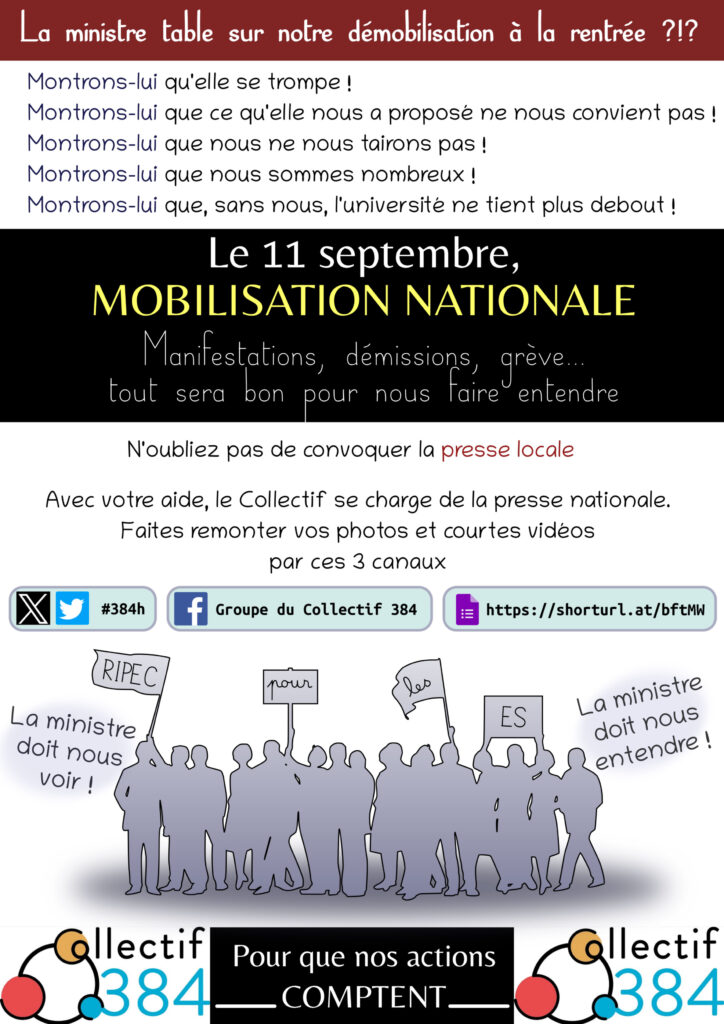 Le 6 septembre, un communiqué de presse a été diffusé pour annoncer la mobilisation, rappeler les revendications du Collectif et appeler à une action visible et coordonnée à 11h dans les universités.